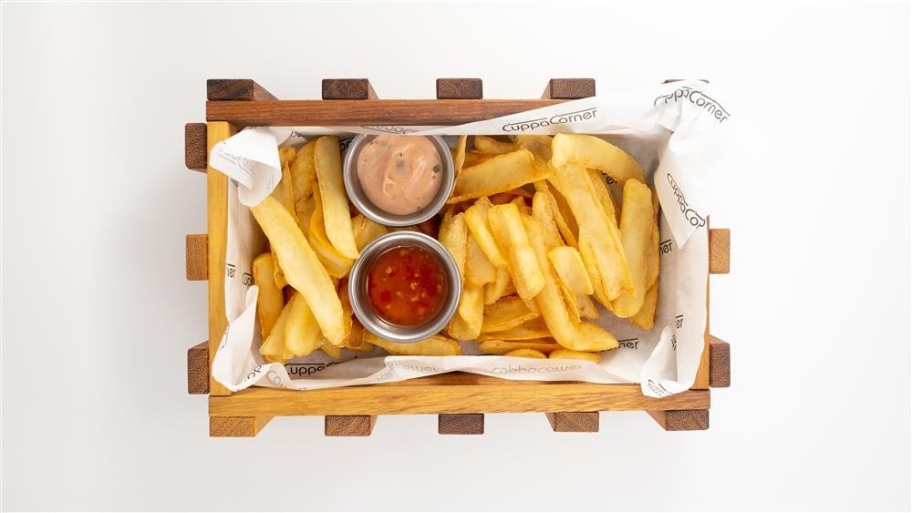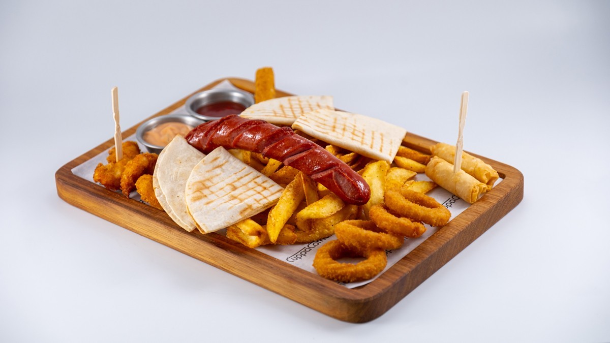 Tortilla ekmeği, soğan halkası, çıtır tavuk dilimleri, sigara böreği, jumbo sosis, mozerella stick, kaşık patates ile servis edilir.