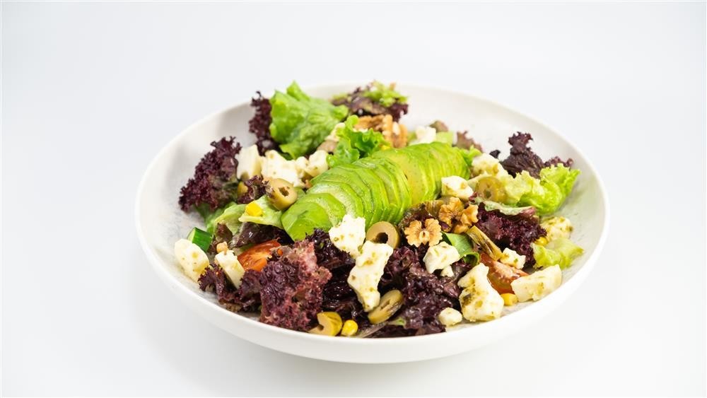 Akdeniz yeşilliği, domates, salatalık, ezine peynir, avokado, ceviz, yeşil zeytin, mısır, havuç, zeytin yağı ve limon sos ile servis edilir