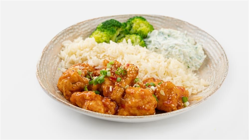 Basmati pirinç pilavı, haşlanmış brokoli, asia usulü tavuk bonfile parçaları, dereotlu yoğurt ile servis edilir.