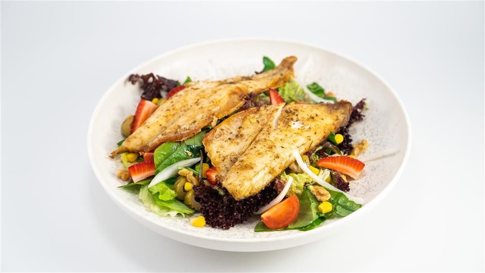 Izgara Levrek, Akdeniz yeşilliği, roka, yeşil zeytin, çeri domates, salatalık, çilek, soğan, tane mısır ve limon sos ile servis edilir