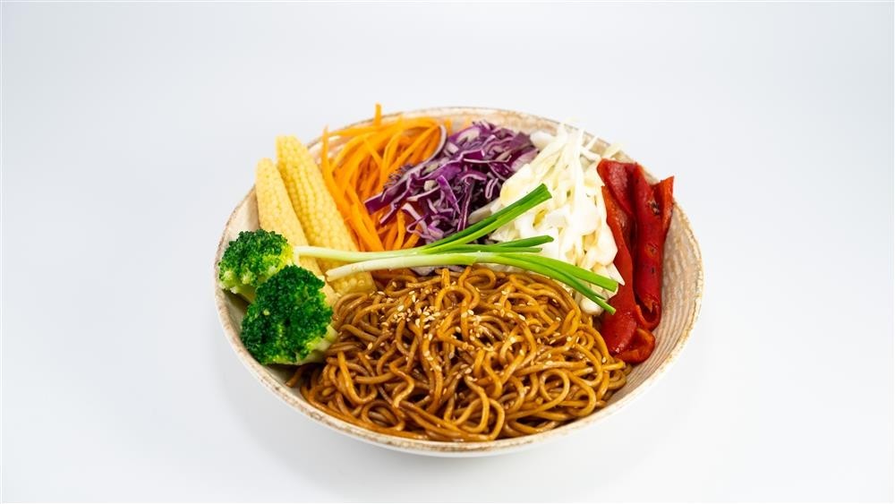 Noodle, soya sos, havuç, beyaz lahana, kırmızı lahana, brokoli, koçan mısır, köz biber, taze soğan ve susam ile servis edilir.