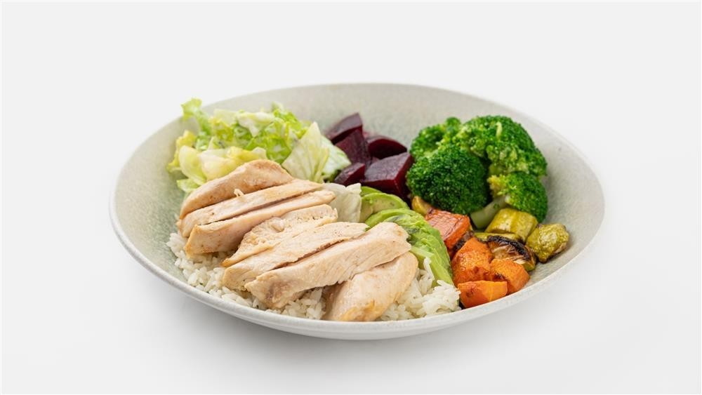 Tavuk bonfile dilimleri, basmati pirinç pilavı, haşlanmış brakoli, avokado, haşlanmış kabak, haşlanmış havuç, pancar ile servis edilir.