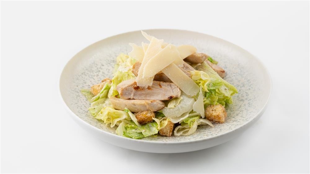 Tavuk bonfile dilimleri, özel sezar sos, marul, parmesan ve tereyağ soslu kroton ile servis edilir.