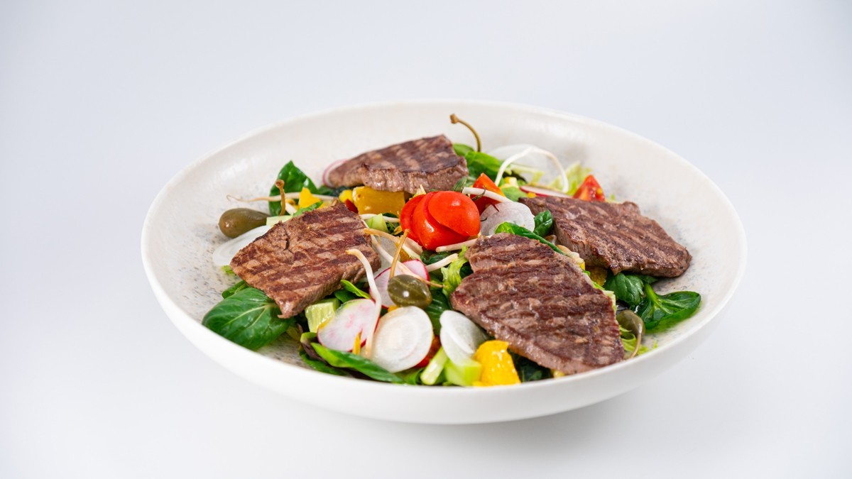 160 gr dana bonfile, akdeniz yeşilliği, çeri domates, kuru soğan, dilim portakal, kapari ve turp ile servis edilir.