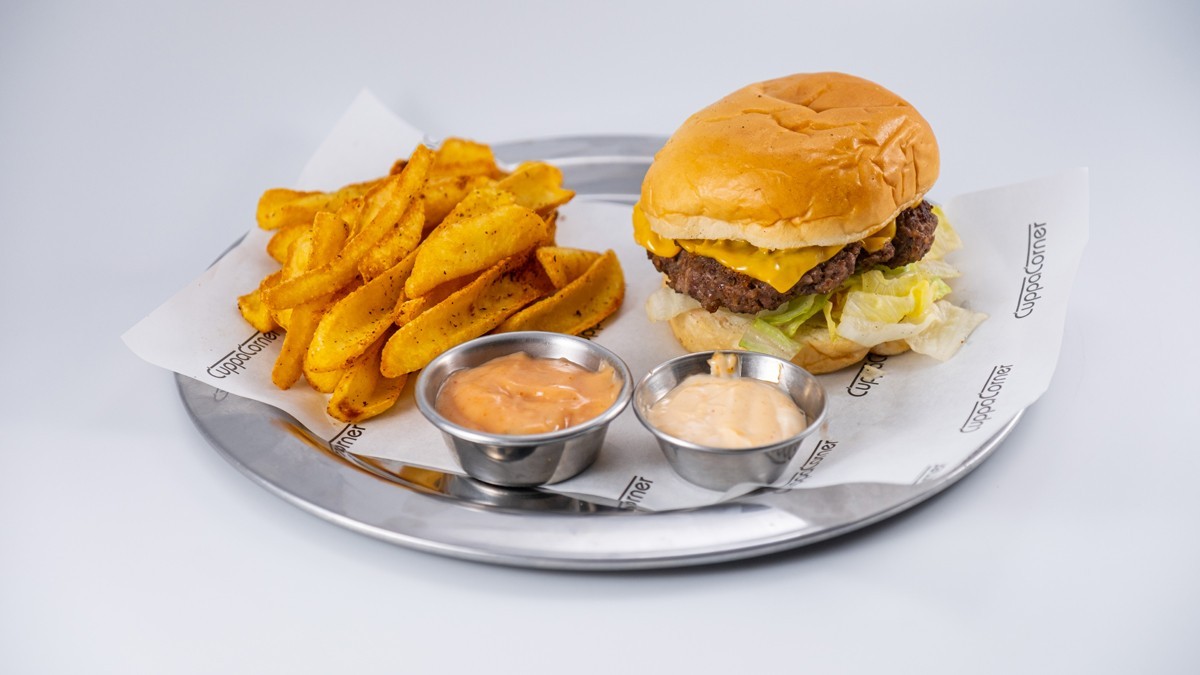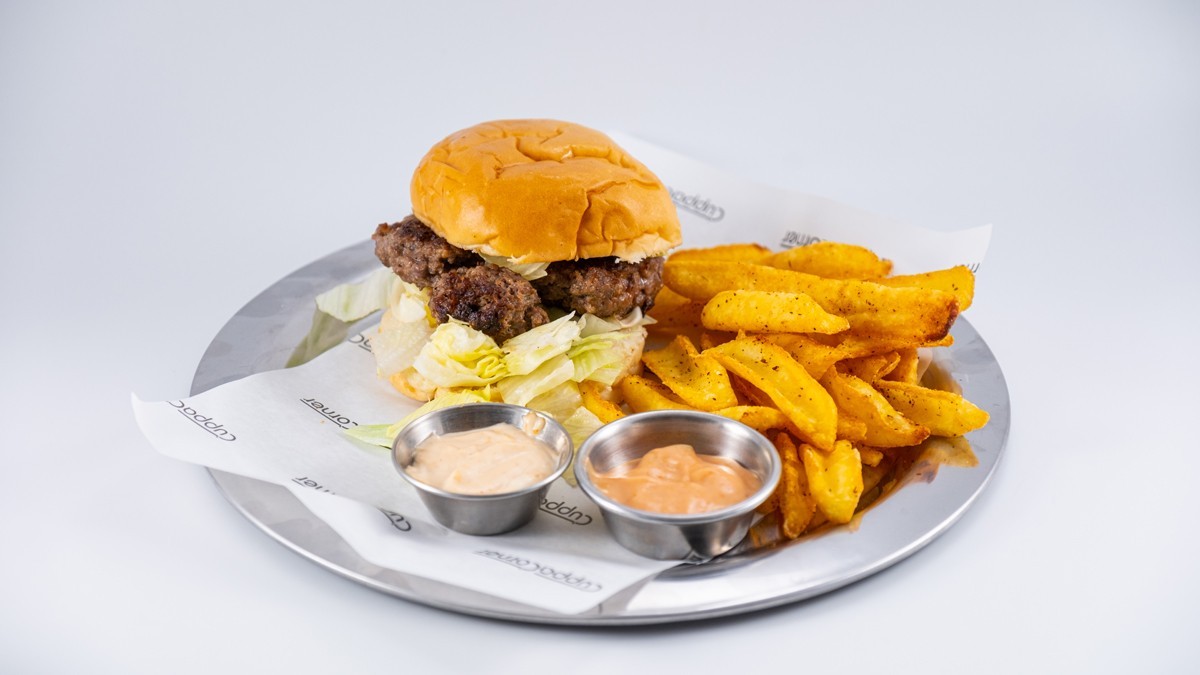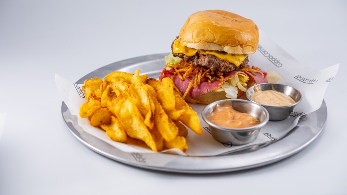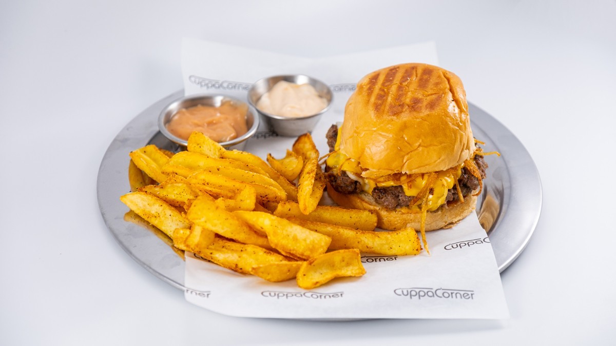 160 gr burger köftesi, soğan, kibrit patates, cheddar peyniri, kaşar peyniri, patates kızarması ve özel sosla servis edilir.