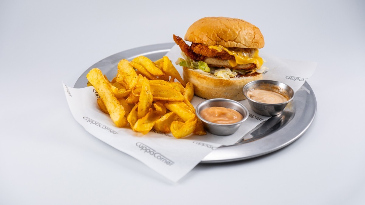 160 gram kızartılmış tavuk, sezar soslu marul, bbq sos, cheddar dilim, patates kızartması , hamburger sos, kornişon turşu ile servis edilir.